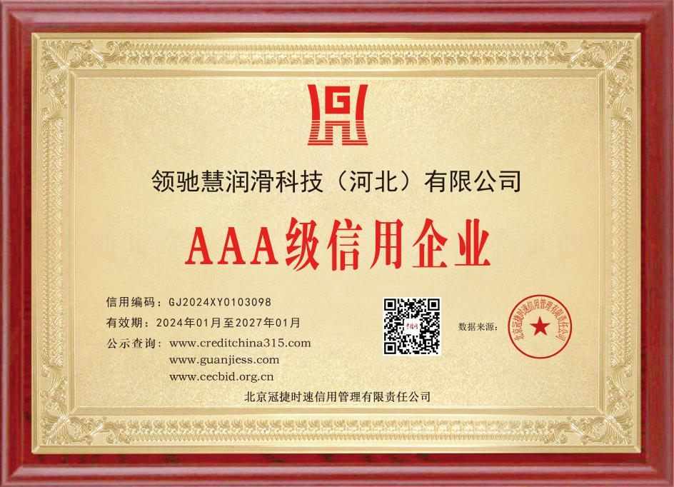 近日,領(lǐng)馳慧潤滑科技(河北)有限公司迎來一個好消息,公司獲得了AAA信用企業(yè)認證的榮譽,此信用等級評定遵循客觀公正、科學規(guī)范的原則,對企業(yè)進行綜合評定。